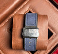 Blue leather or suede strap with stitched detailing