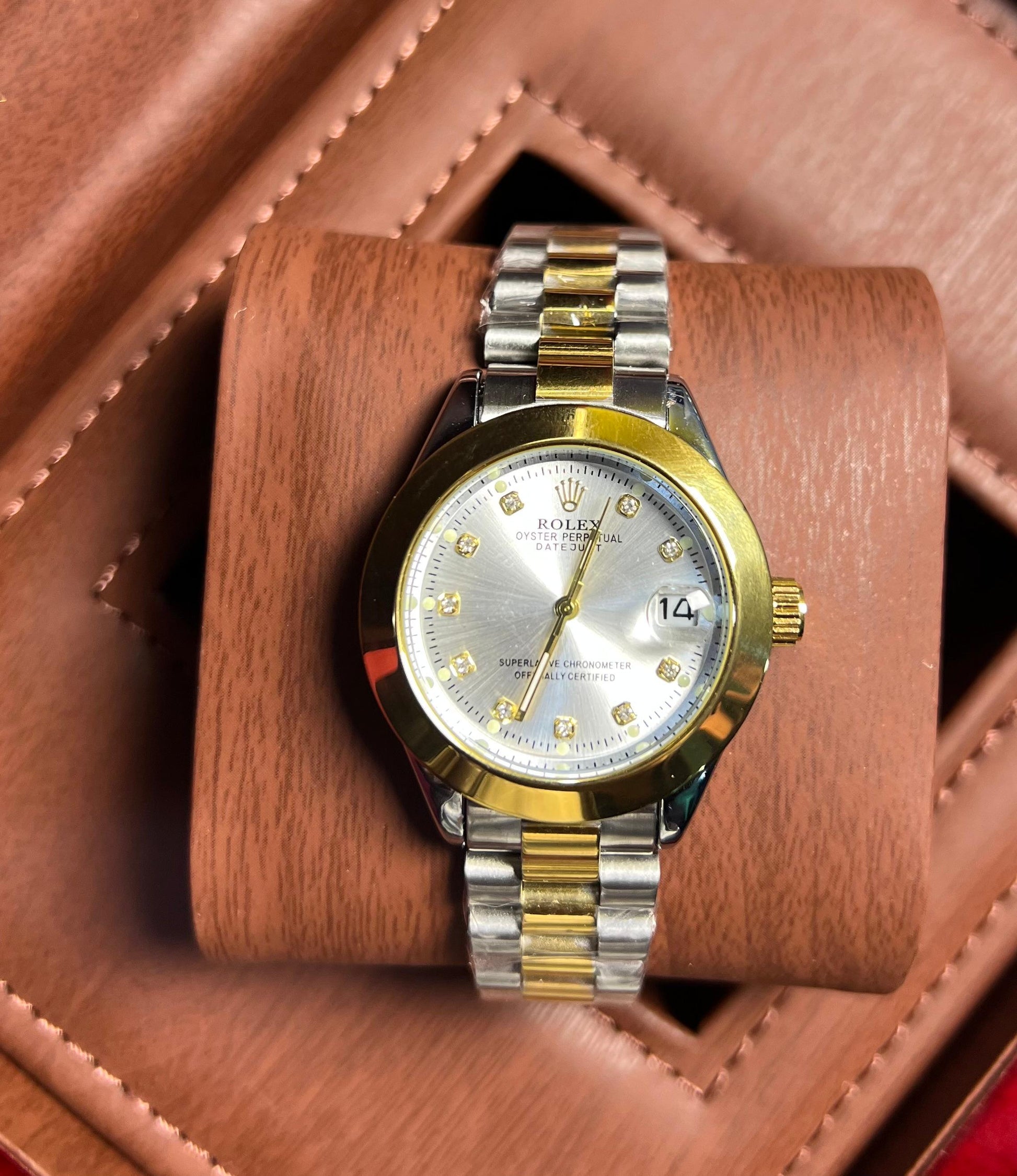 The ROLEX Datejust “Golden Grace” Edition is a radiant expression of classic luxury tailored for the modern woman. With its two-tone bracelet, diamond hour markers, and signature cyclops date lens, this timepiece blends precision with poise. It’s designed for those who lead with elegance, confidence, and enduring style.